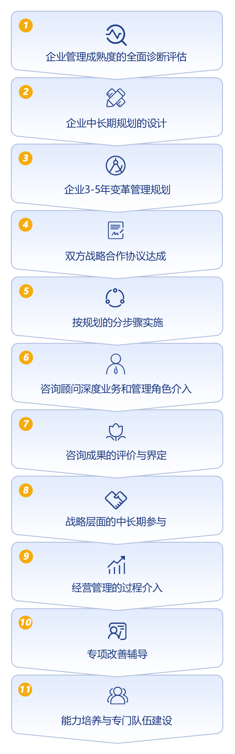 企業管理成熟度的全面診斷評估 企業中長期規劃的設計 企業3-5年變革管理規劃 雙方戰略合作協議達成 按規劃的分步驟實施 咨詢顧問深度業務和管理角色介入 咨詢成果的評價與界定 戰略層面的中長期參與 經營管理的過程介入 專項改善輔導 能力培養與專門隊伍建設